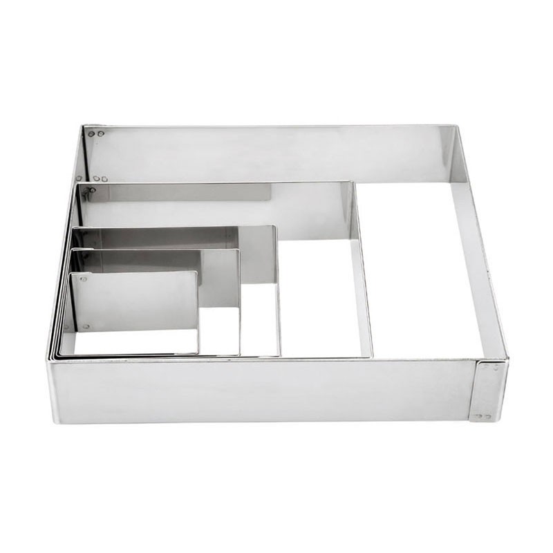Erweitern Quadratische pfanne aus edelstahl 18/10, 4 cm höhe um gegrilltes, beilagen, salate, desserts oder montieren sie gerichte wie steak tartar oder ähnliches. In verschiedenen abmessungen erhältlich.