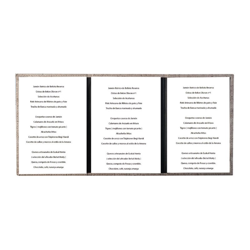 Werbeschriften sammlung Marcel hergestellt in kunstleder mit heißsiegeln in der farbe schwarz und 3 klappen transparent. Ideal für gastgewerbe. Größe A5: 17x24 cm