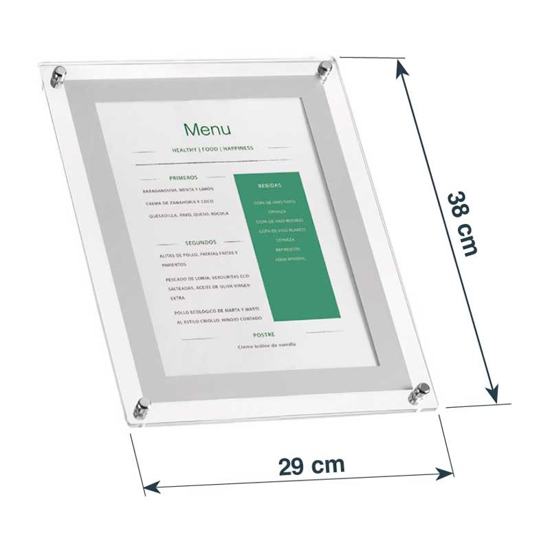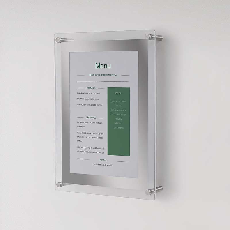 Menu-Ständer A4-Format mit Acryl-Tableau. Freistehend oder fur Wand- oder Tischmontage.