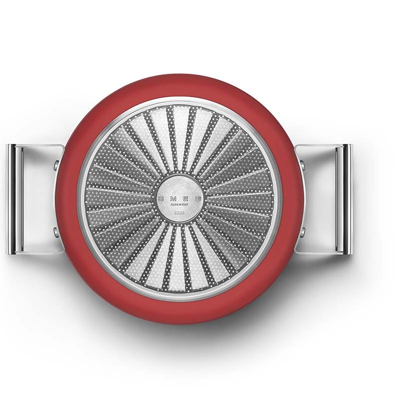 Antihaftbeschichteter Kochtopf mit Deckel im Smeg-Stil der 50er Jahre, 24 cm Durchmesser, Gehäuse aus geschmiedetem Aluminium und mattroter Außenlackierung.