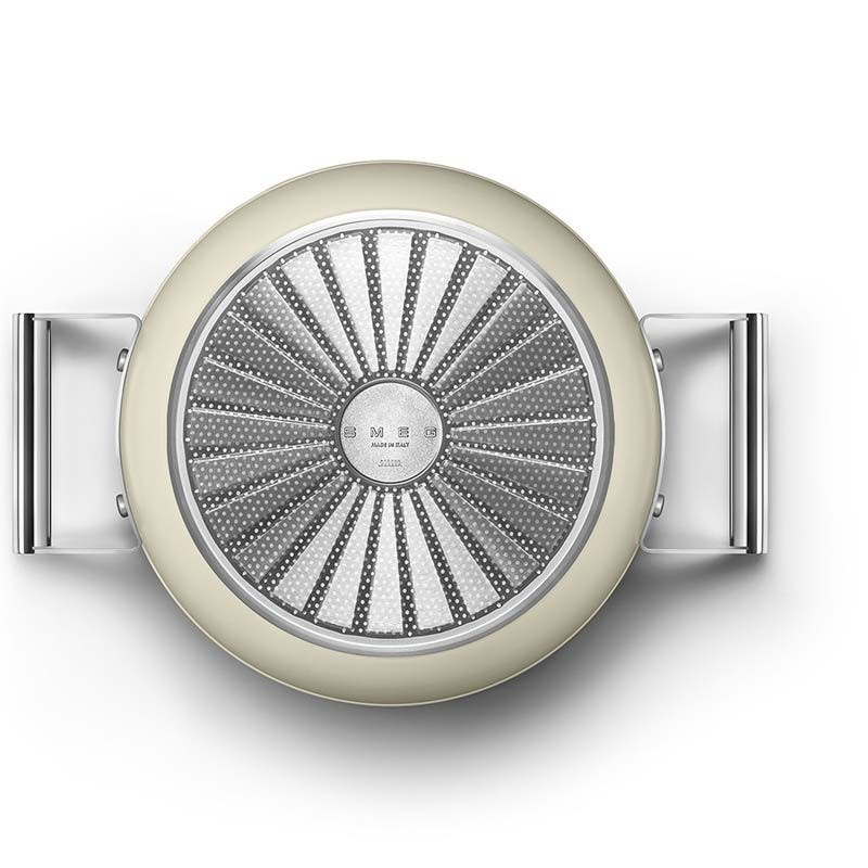 Antihaftbeschichteter Kochtopf mit Deckel im Smeg-Stil der 50er Jahre, 24 cm Durchmesser, Gehäuse aus geschmiedetem Aluminium und matt cremefarbener Außenlackierung.
