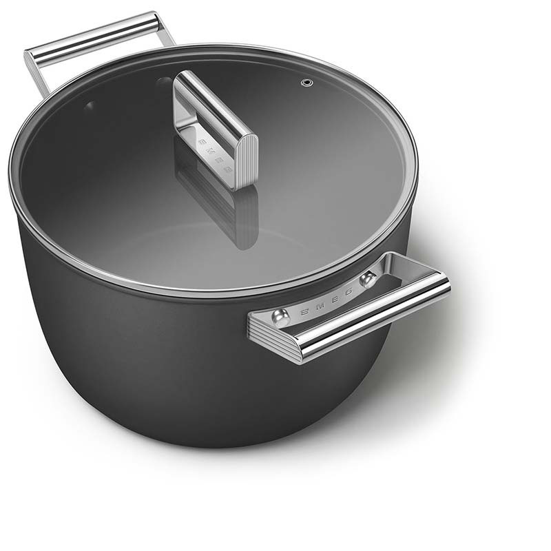 Antihaftbeschichteter hoher Kochtopf mit Deckel im Smeg 50er-Jahre-Stil mit einem Durchmesser von 26 cm, Gehäuse aus geschmiedetem Aluminium und mattschwarzem Außenlack.