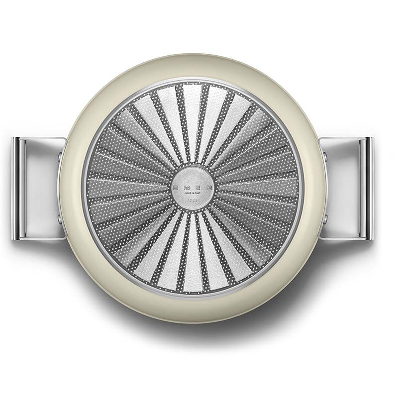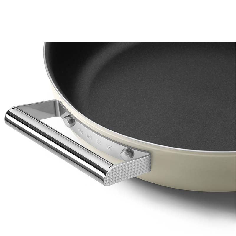Niedriger Antihaft-Topf mit Deckel im Smeg 50er-Jahre-Stil mit einem Durchmesser von 28 cm, einem Gehäuse aus geschmiedetem Aluminium und einer matten cremebeigen Außenoberfläche.