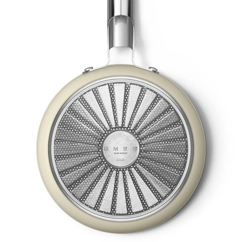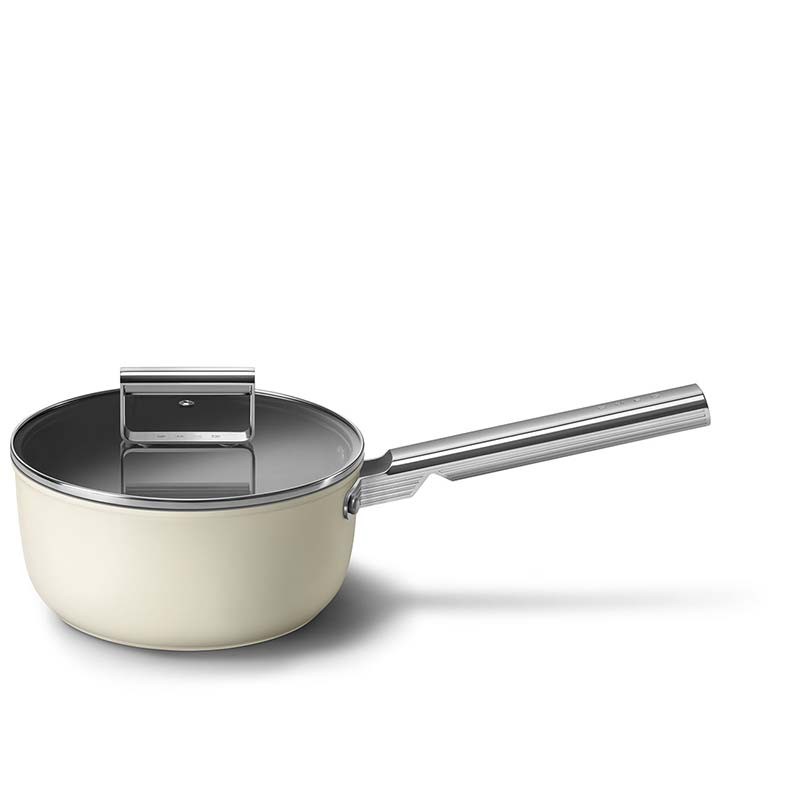 Antihaftbeschichteter Kochtopf mit Deckel im Smeg 50er-Jahre-Stil mit einem Durchmesser von 20 cm, Gehäuse aus geschmiedetem Aluminium und matt cremefarbenem Außenlack.