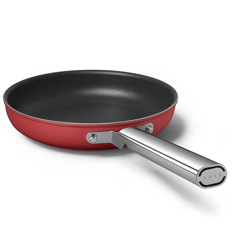 Antihaft-Bratpfanne im Smeg 50er-Stil mit 24 cm Durchmesser, Gehäuse aus geschmiedetem Aluminium und mattroter Außenlackierung.