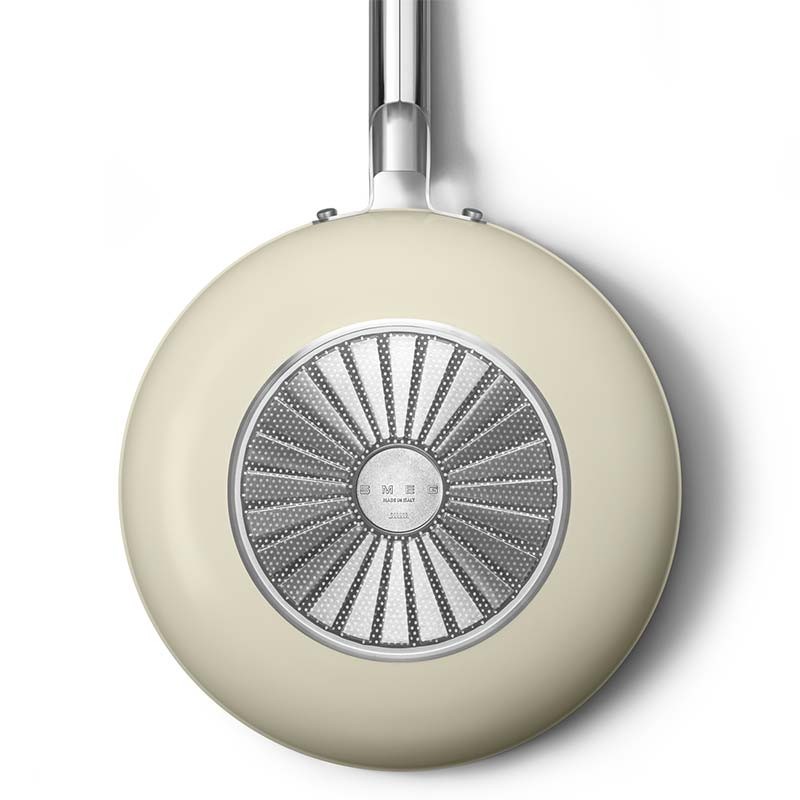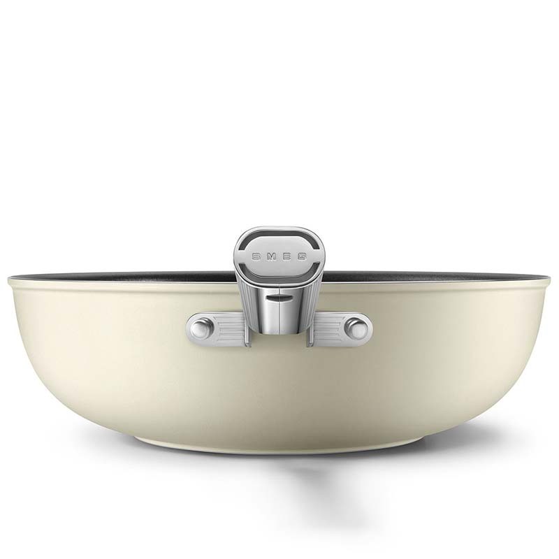 Smeg Antihaft-Wok im Stil der 50er Jahre mit einem Durchmesser von 30 cm, geschmiedetem Aluminiumgehäuse und mattem cremebeigem Außenlack.