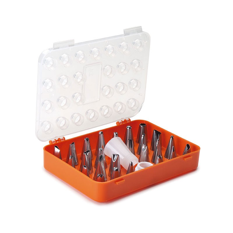 Erweitern Schuber mit 26 düsen - gebäck vielfältig zum dekorieren, mit spritzbeutel, aus edelstahl von hoher qualität.
