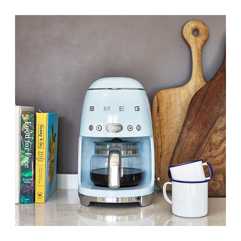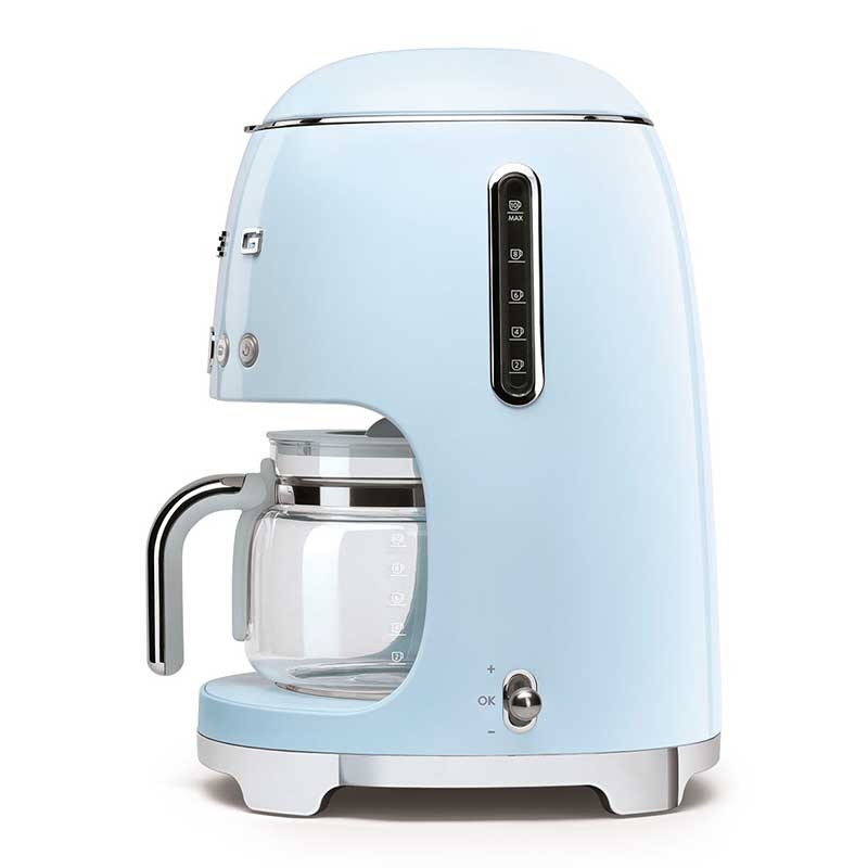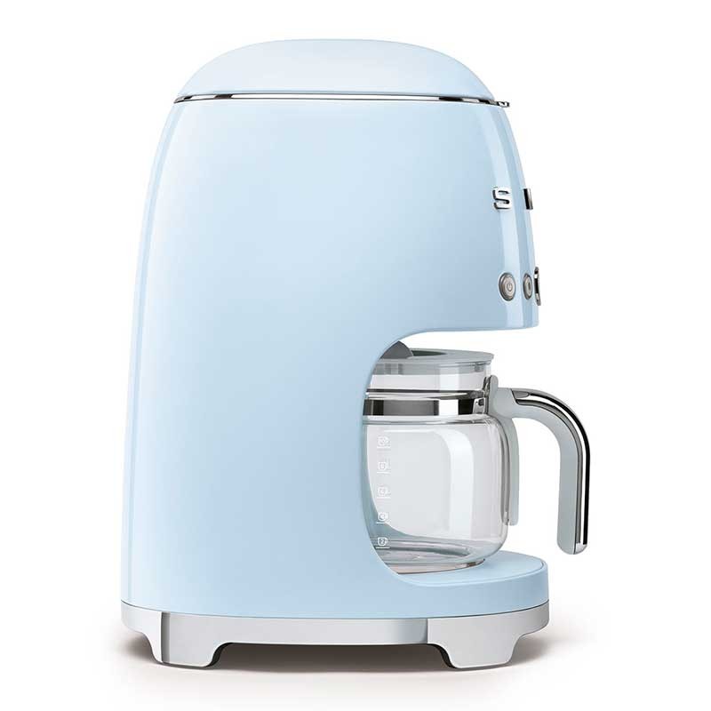 Drip Kaffeemaschine-Filter im Stil der 50er Jahre mit einstellbarer Kaffeeintensitätsauswahl und Edelstahlgehäuse und ABS Sky Blue Gloss Finish.
