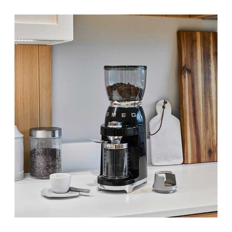 Elektrische Kaffeemühle im 50er-Jahre-Stil mit 30 verschiedenen Getreideschleifstufen und Edelstahlgehäuse in glänzendem Schwarz.