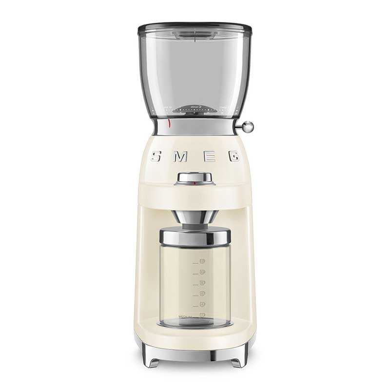 Erweitern Elektrische Kaffeemühle im 50er-Jahre-Stil mit 30 verschiedenen Kornmahlstufen und Edelstahlgehäuse mit Glanzcreme.
