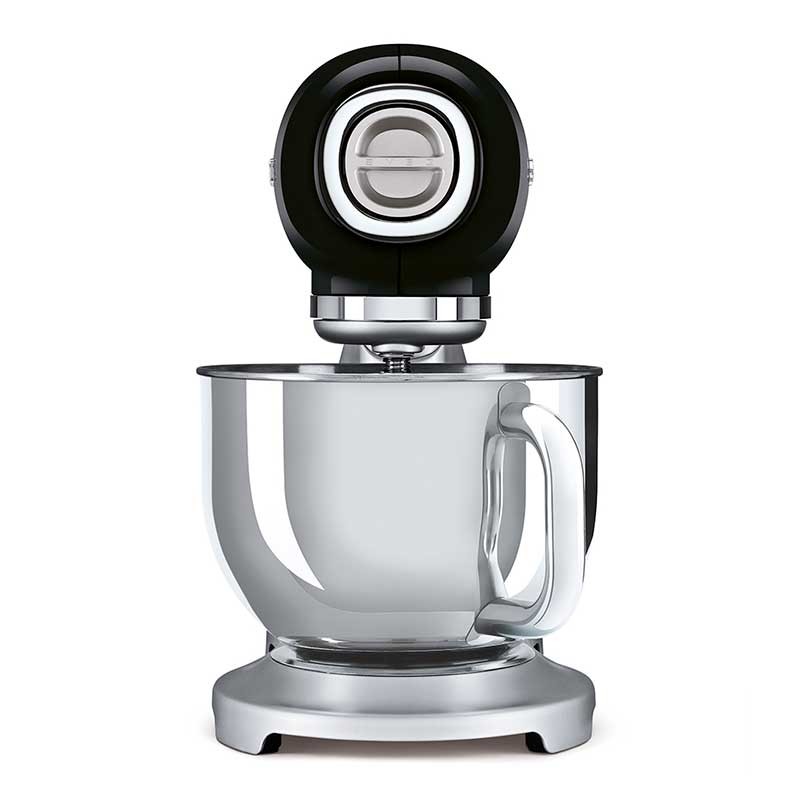 Mixer im 50er-Jahre-Stil mit Aluminiumgussgehäuse, oberer Abdeckung in glänzendem Schwarz, 800 W Leistung und 10 Geschwindigkeiten.