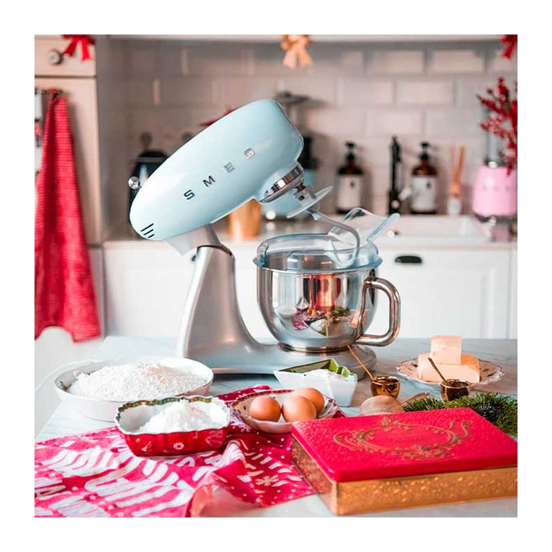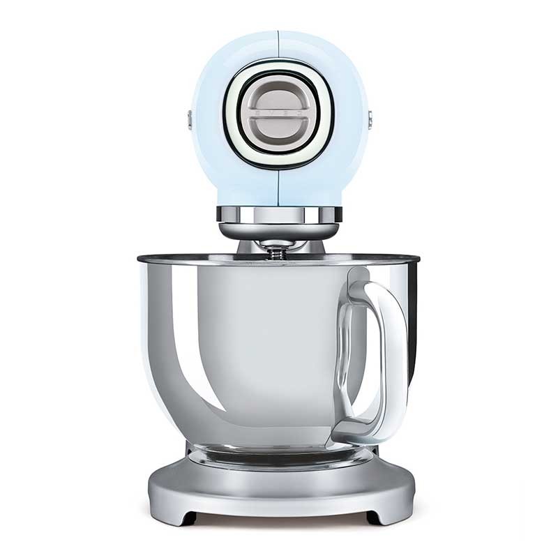 Mixer im 50er-Jahre-Stil mit Aluminiumgussgehäuse, oberer Abdeckung in hellem himmelblauem Finish, 800 W Leistung und 10 Geschwindigkeiten.
