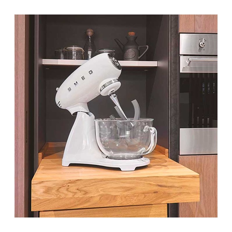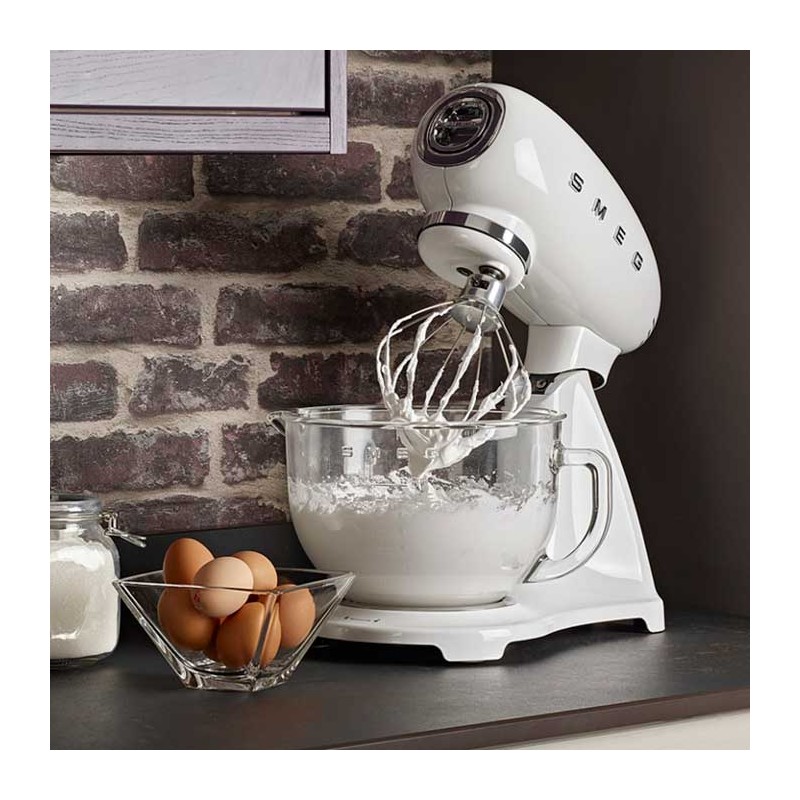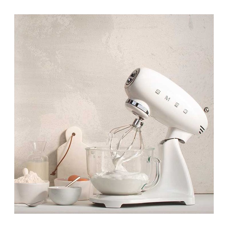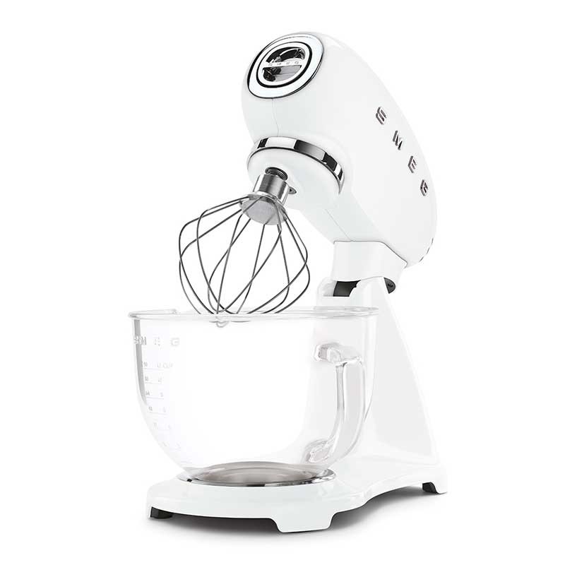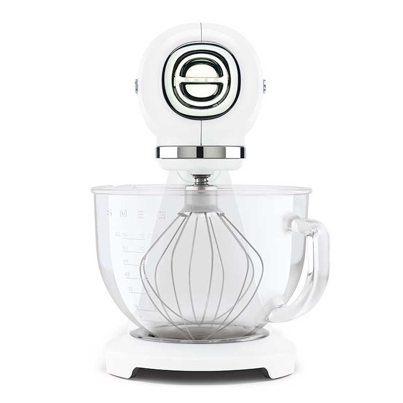 Mixer im 50er-Jahre-Stil Vollfarb-Glanz-Weiß-Finish mit Aluminiumguss-Körper, 800 W Leistung und 10 Geschwindigkeiten.