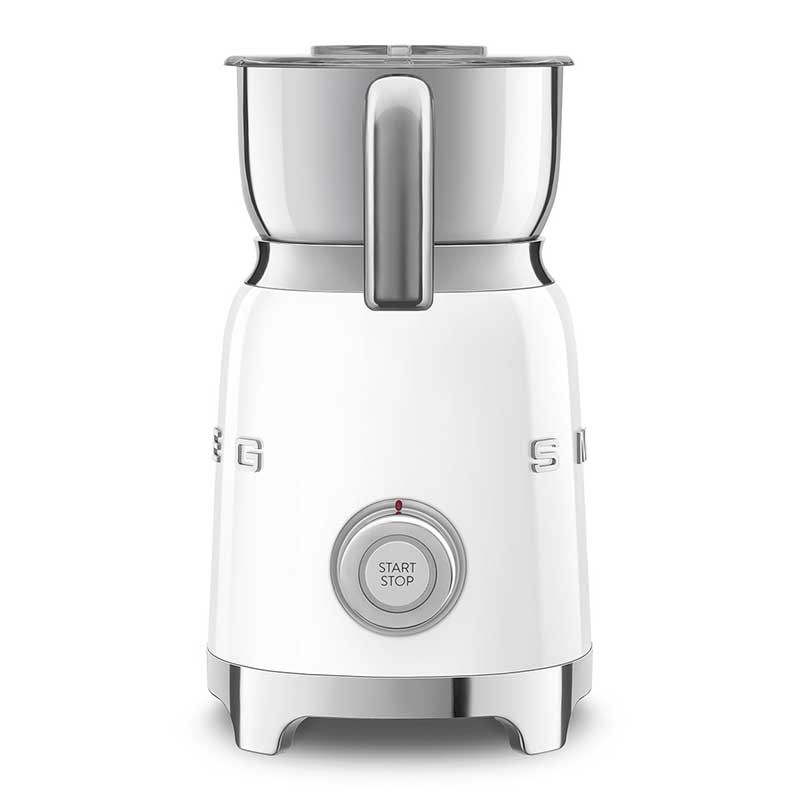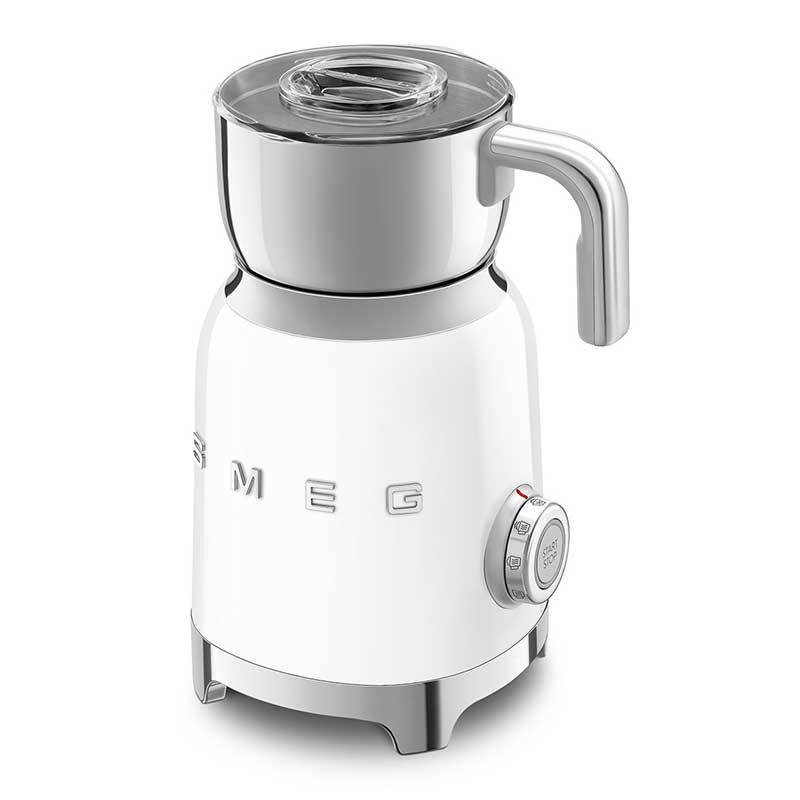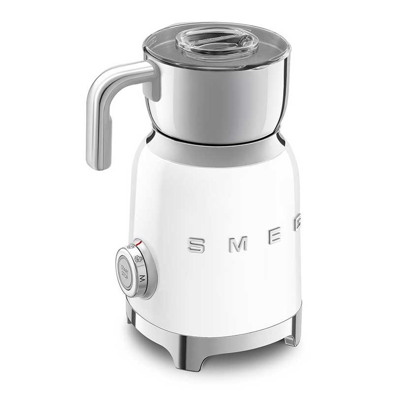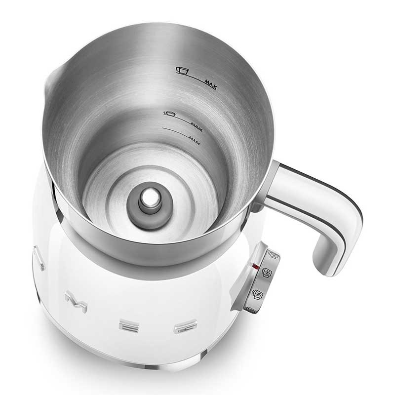 Milchaufschäumer im 50er-Jahre-Stil mit Edelstahlgehäuse mit glänzendem weißem Finish und 6 Programmen zur Zubereitung heißer oder kalter Getränke mit oder ohne Schaum.