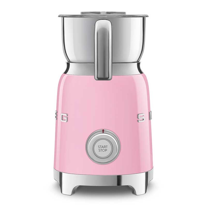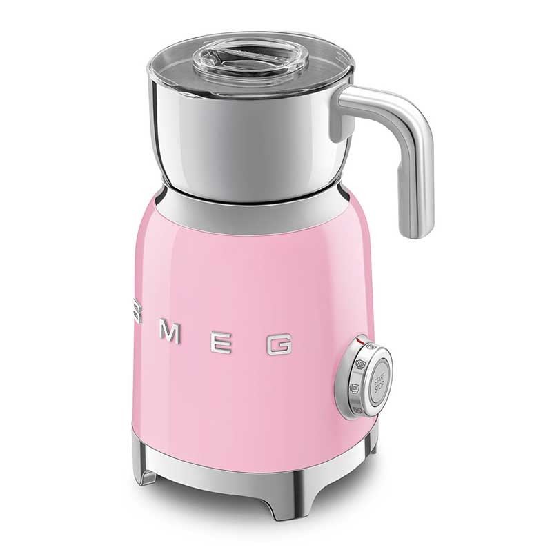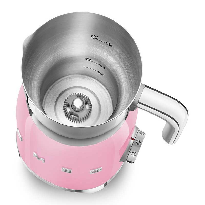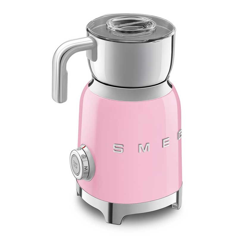 Milchaufschäumer im 50er-Jahre-Stil mit Edelstahlgehäuse in glänzendem Rosa Finish und 6 Programmen zur Zubereitung heißer oder kalter Getränke mit oder ohne Schaum.
