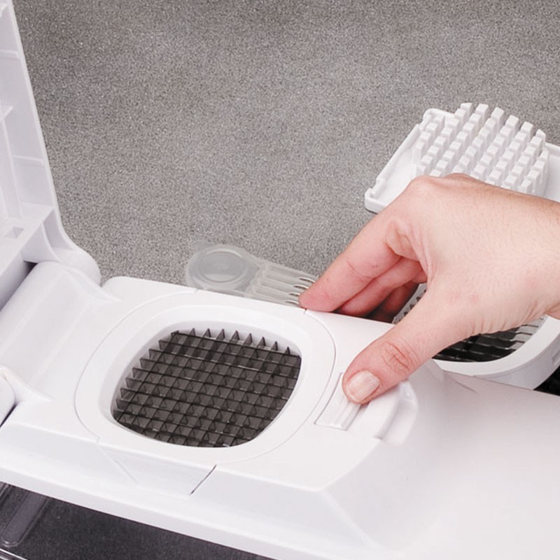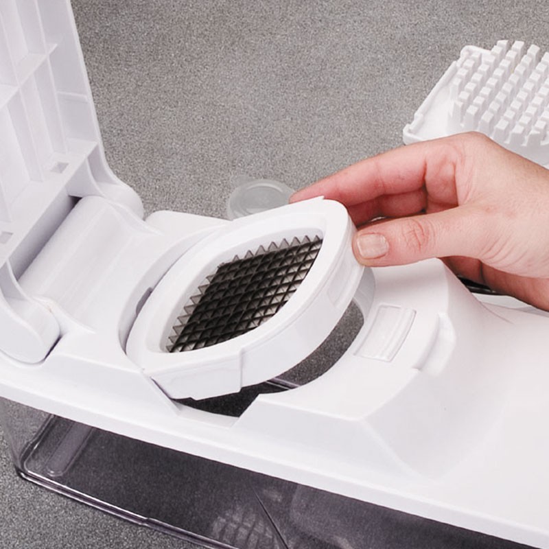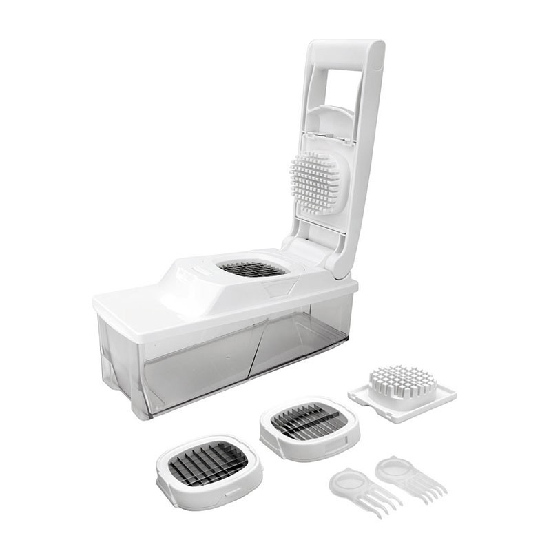 Schneider presse - gemüse und pommes-frites-behälter und zubehör für verschiedene arten von schneiden. Hergestellt aus kunststoff TPR robust und klingen aus rostfreiem stahl. Maße: 11,5x21,5x11 cm