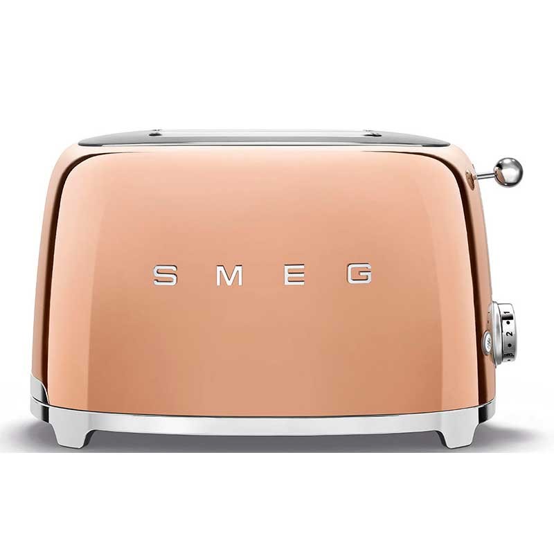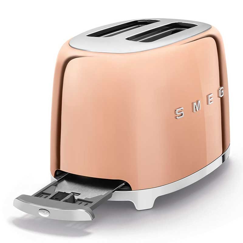 Toaster im 50er-Jahre-Stil mit glänzendem Roségold-Edelstahlgehäuse mit 6 Heizstufen und 2 Steckplätzen für 2 Toasts.