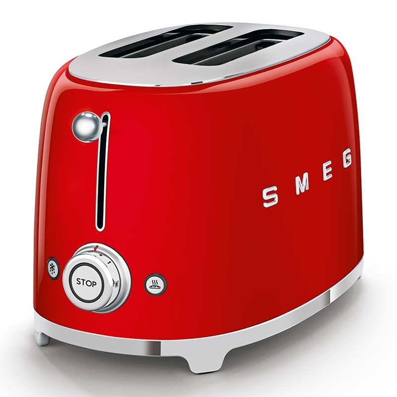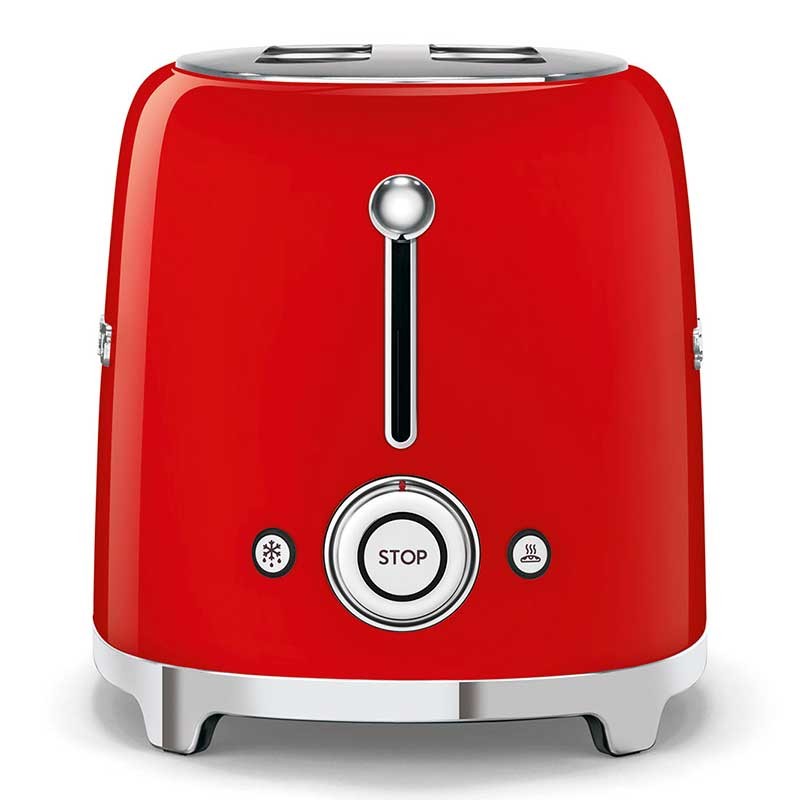 Toaster im 50er-Jahre-Stil mit leuchtend rotem Edelstahlgehäuse mit 6 Heizstufen und 2 Steckplätzen für 2 Toasts.