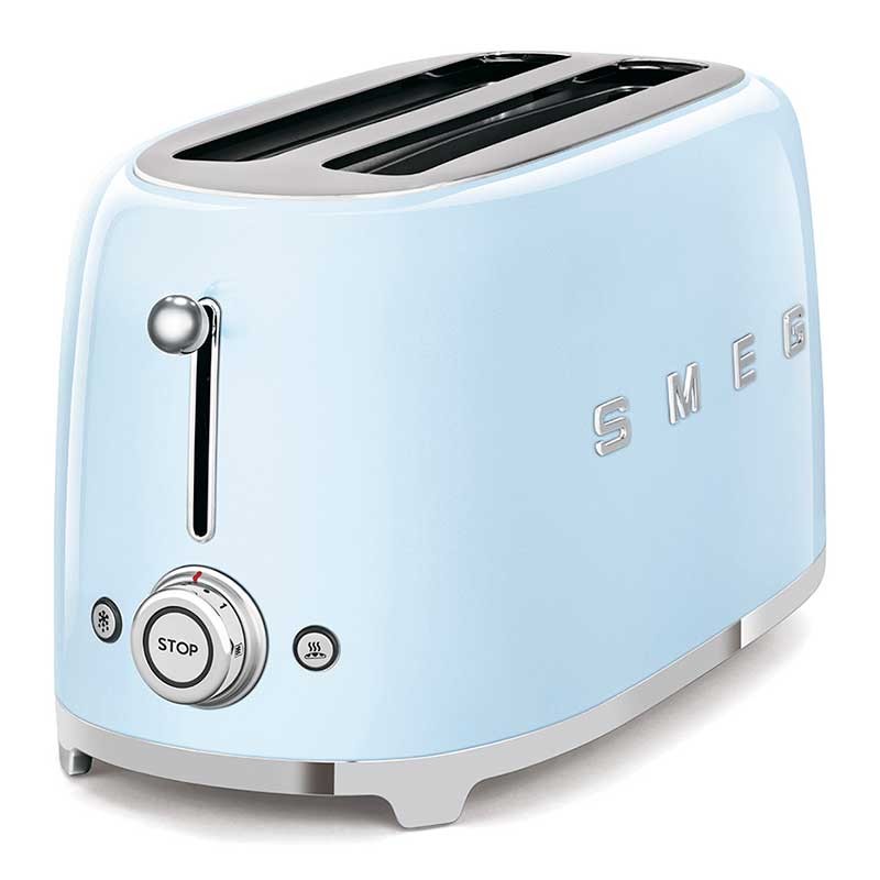 Toaster im 50er-Jahre-Stil mit Edelstahlgehäuse in leuchtender himmelblauer Farbe mit 6 Heizstufen und 2 Steckplätzen für 4 Toasts.