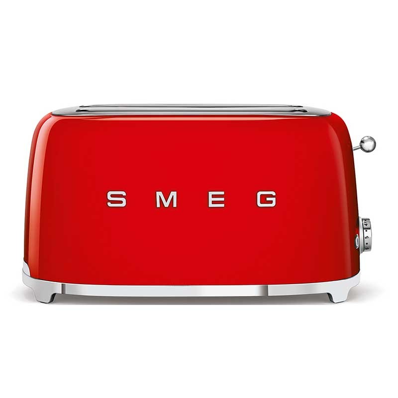 Toaster im 50er-Jahre-Stil mit leuchtend rotem Edelstahlgehäuse mit 6 Heizstufen und 2 Steckplätzen für 4 Toasts.