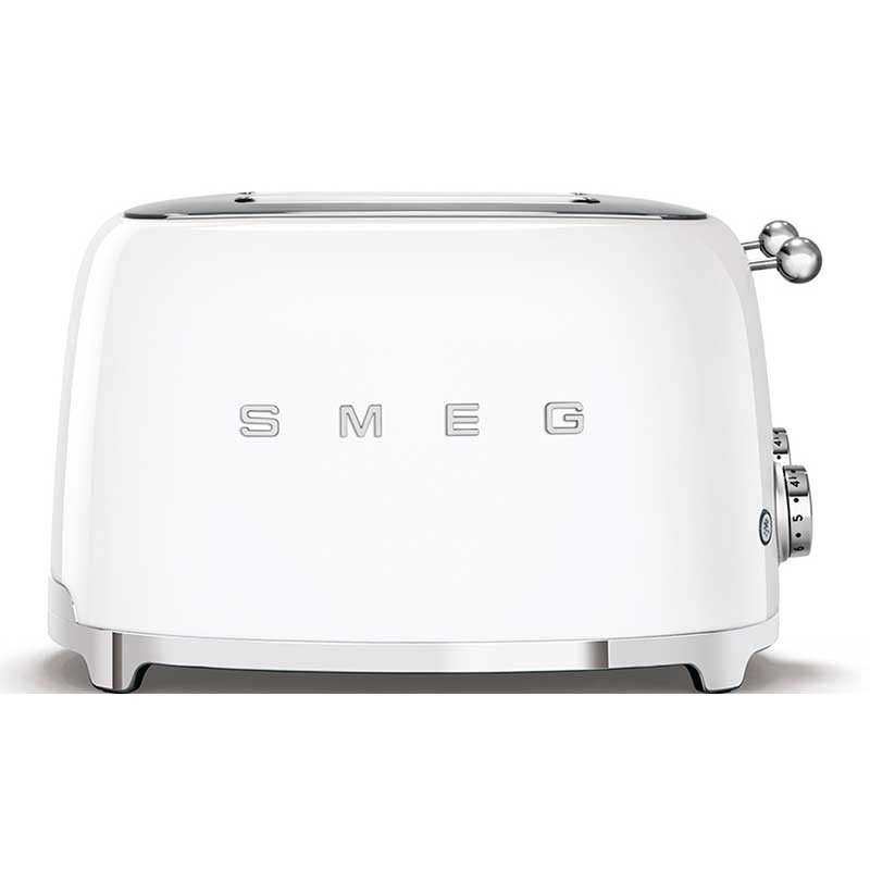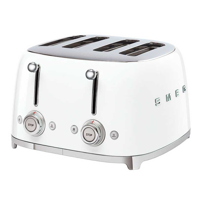 Toaster im 50er-Jahre-Stil mit glanzweißem Edelstahlgehäuse mit 6 Heizstufen und 4 Steckplätzen für 4 Toasts.