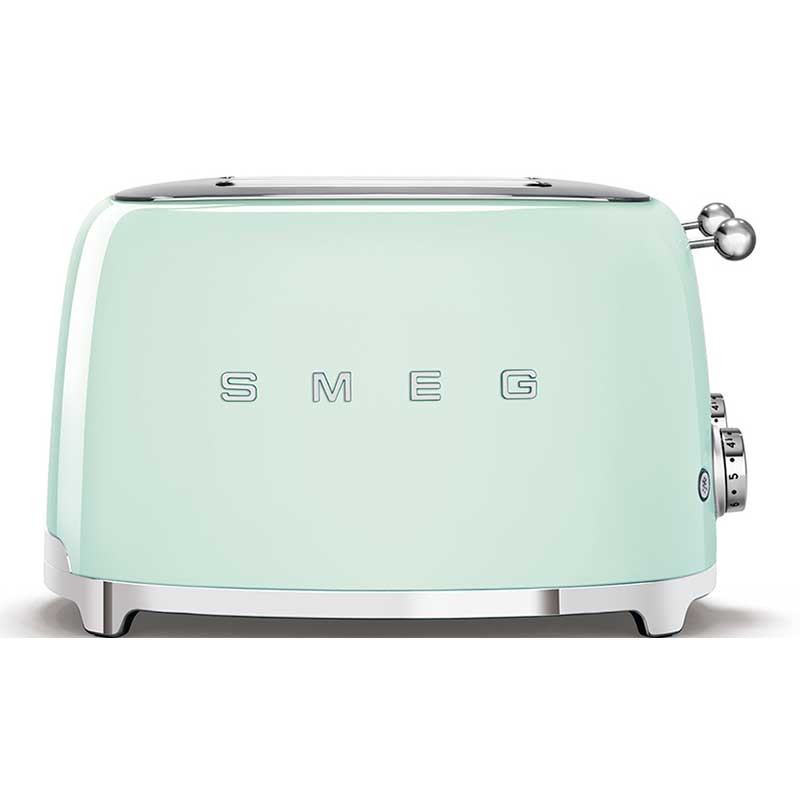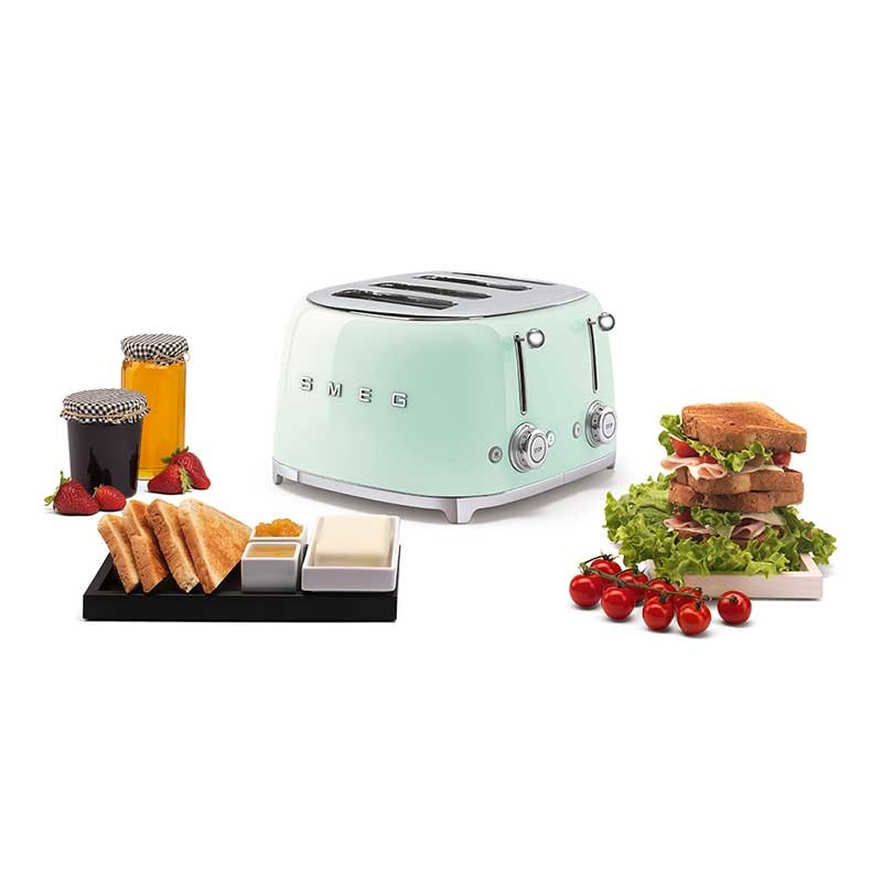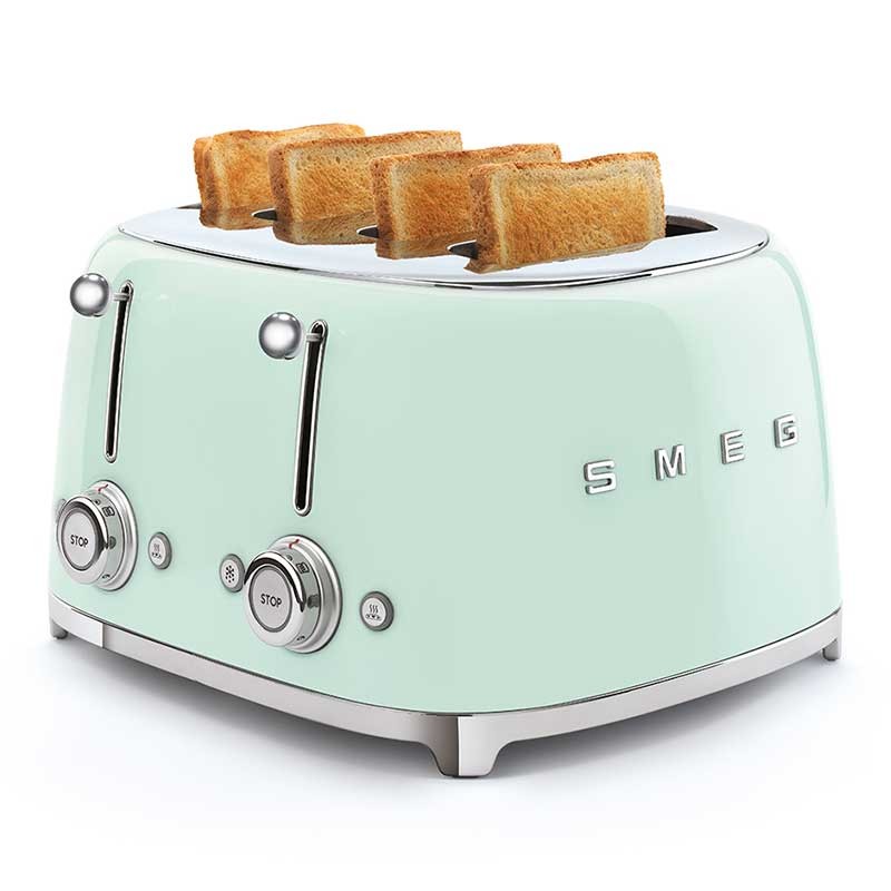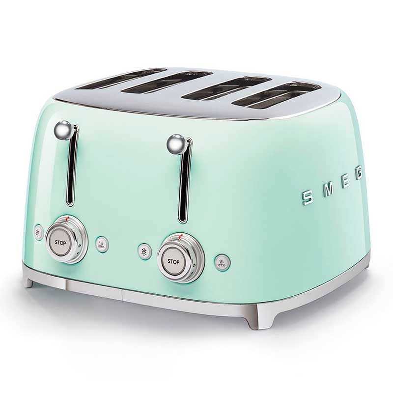 Toaster im 50er-Jahre-Stil mit Edelstahlgehäuse Farbe grün Wasserglanz mit 6 Heizstufen und 4 Steckplätzen für 4 Toasts.