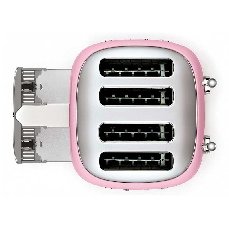 Toaster im 50er-Jahre-Stil mit glanzrosa Edelstahlgehäuse mit 6 Heizstufen und 4 Steckplätzen für 4 Toasts.