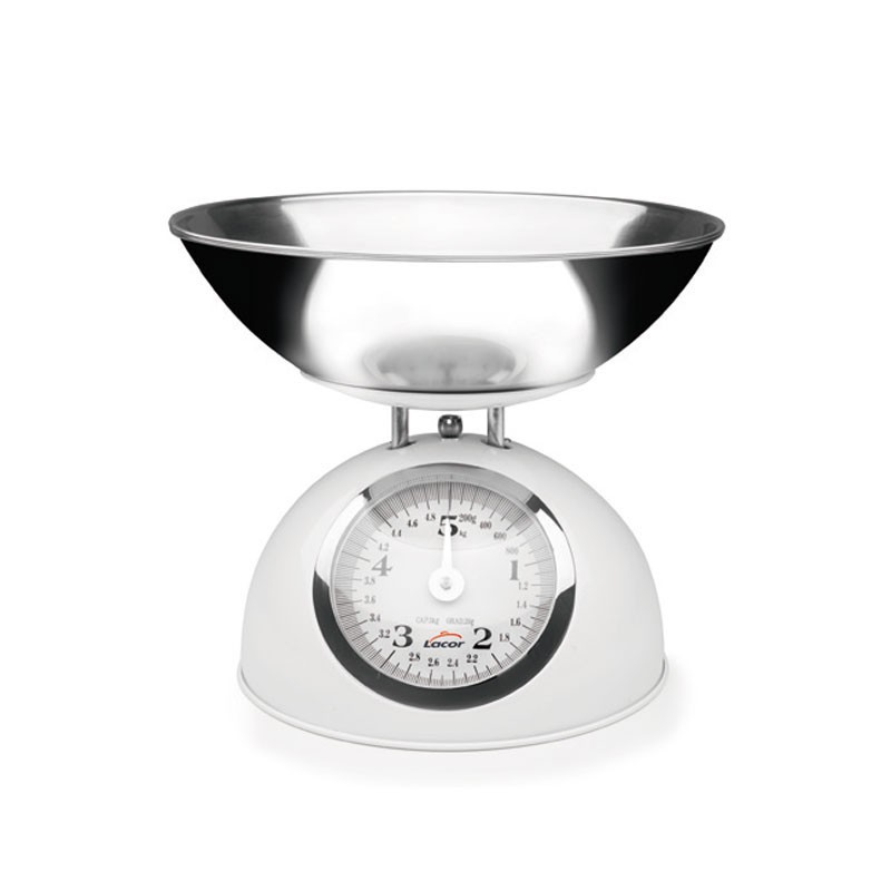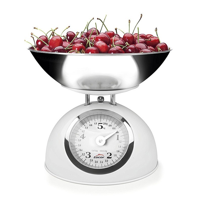 Waage mechanisch Retro White schüssel 24 cm durchmesser und 2 L fassungsvermögen-hergestellt aus edelstahl von hoher qualität und beständigkeit gegen korrosion. Eigengewicht: 5kg. Teilung: 20g.