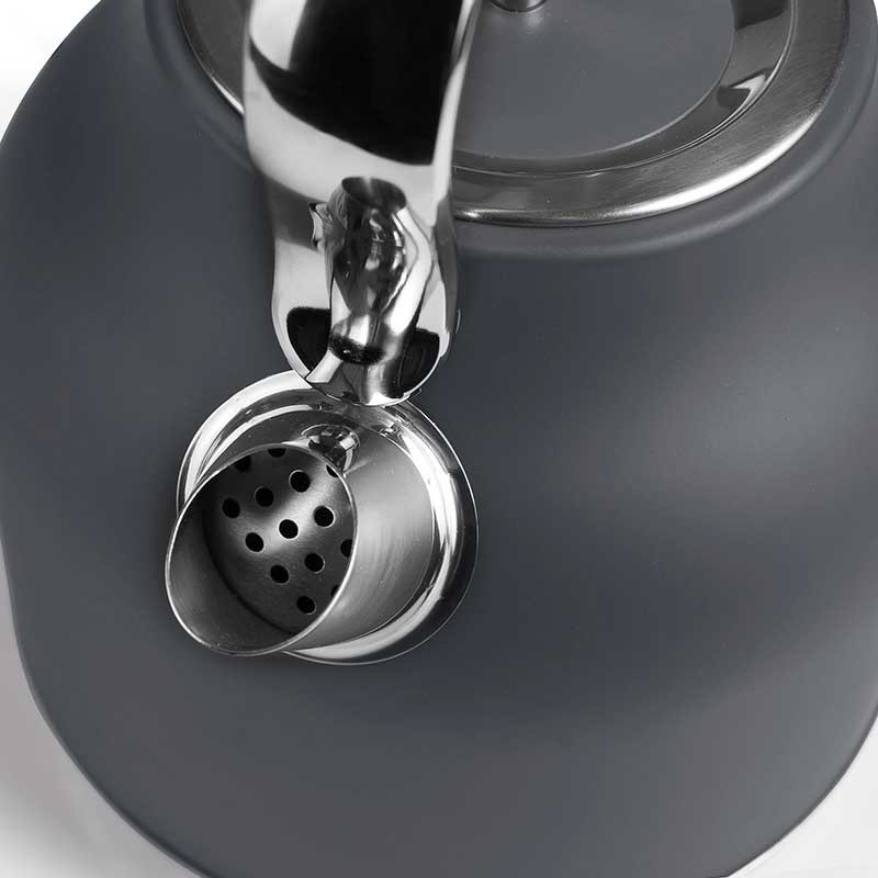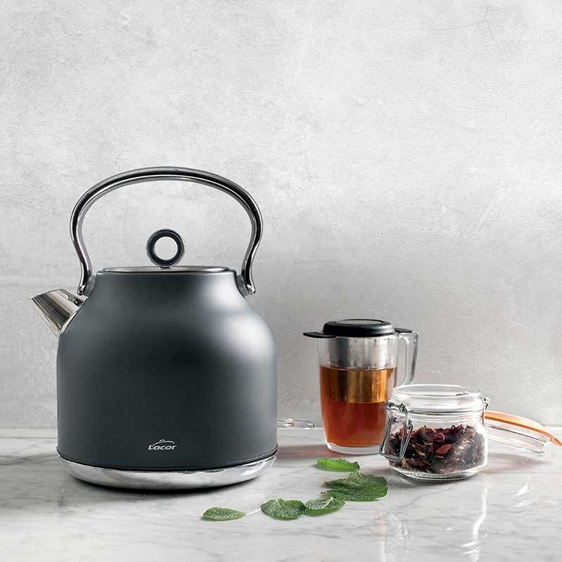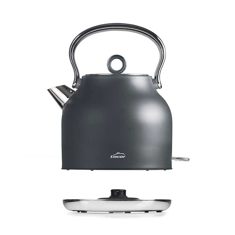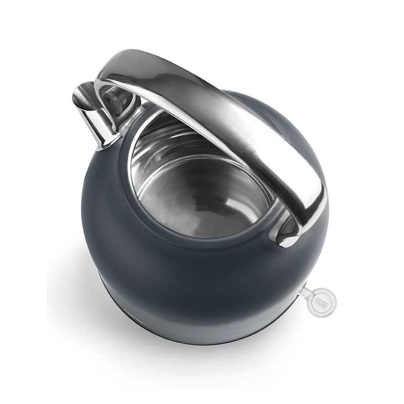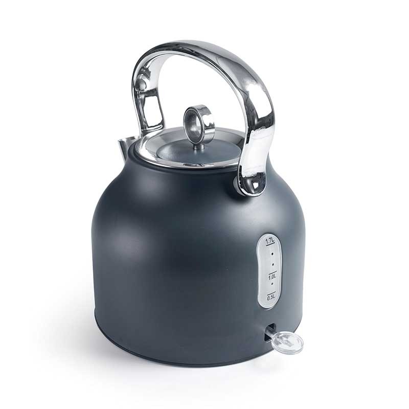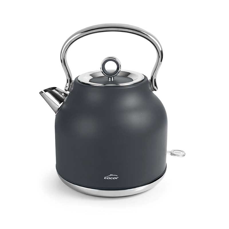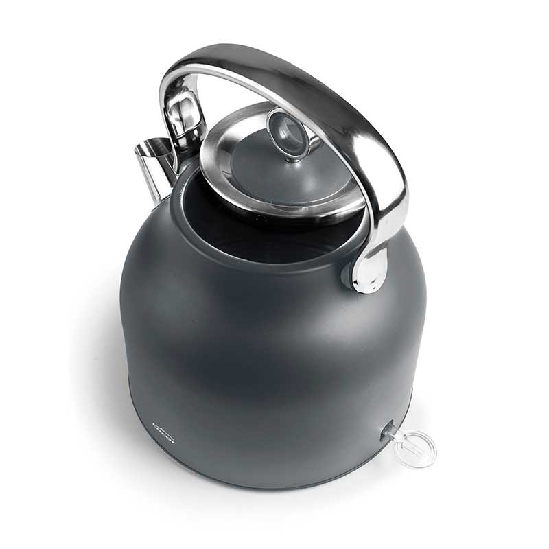Elektrische Wasserkocher 2200 W Retro Modell aus Edelstahl 18/10 mit mattgrauer Oberfläche.