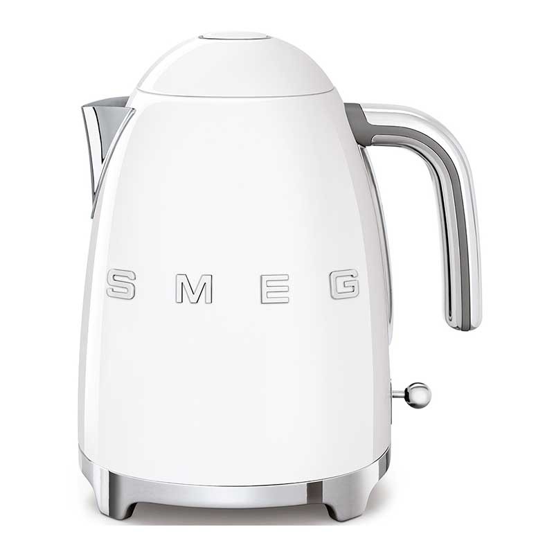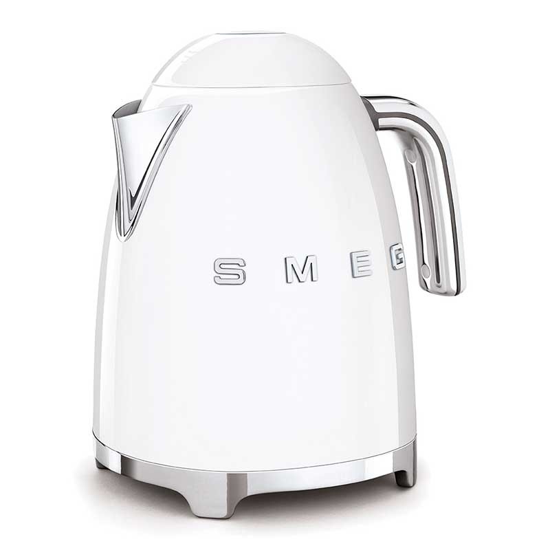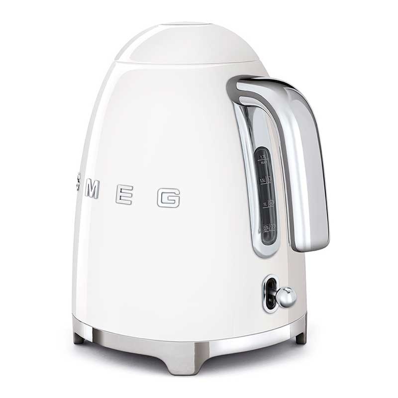 Standard Wasserkocher im 50er-Jahre-Stil von 1,7 Litern Fassungsvermögen mit Edelstahlgehäuse glänzend weiß und 360º Schwenkfuß.